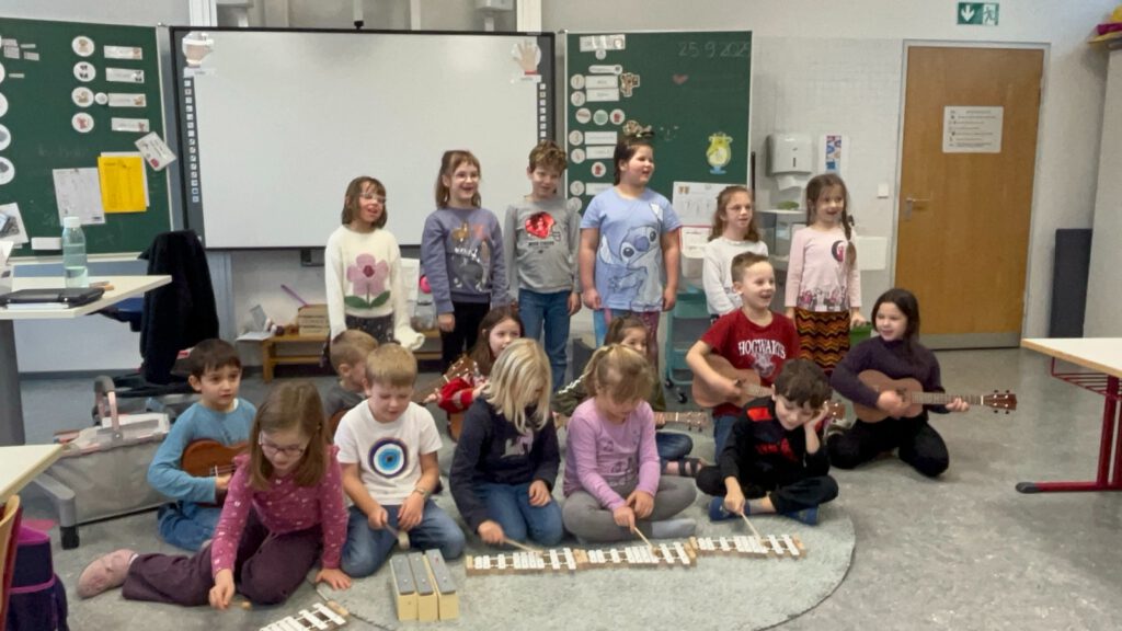 Die Klasse 1a sang ihm die Lieder „Lasst uns froh und munter sein“ und „Stern über Betlehem“ vor. Die Klasse 1b trug ein selbst geschriebenes Nikolauslied, auf die Melodie von „Bruder Jakob“ vor, das von den Kindern mit Instrumentenklang untermalt wurde. Die Klasse 1c hatte ein umgedichtetes Weihnachtsmannlied auf die Melodie von „Hejo, spann den Wagen an“ vorbereitet.